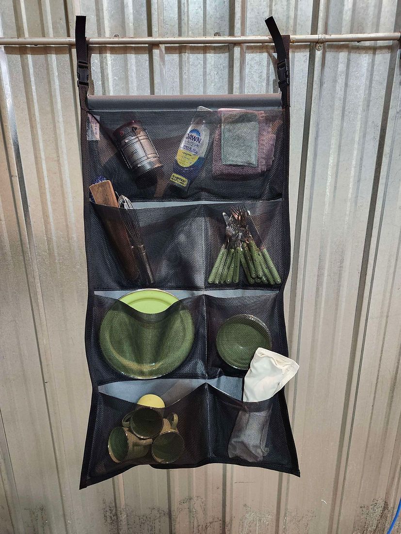 Both of our organziers are built out of our 1200 Denier cordura material. They have a wood dowel rod at the top to hold its shape with an adjustable webbing loop and fastex buckle on each end to hang from.